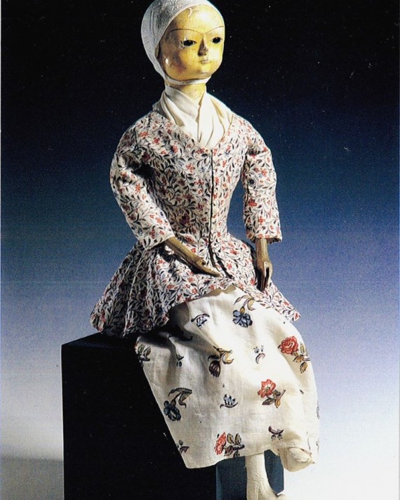 Hier sehen Sie eines unserer ältesten Exponate im Museumsbestand. Dabei handelt es sich um eine Holzpuppe im Queen-Anne-Stil aus England, die aus dem 18. Jahrhundert stammt und 65 cm groß ist.