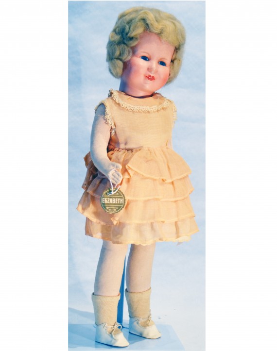 Weil die Puppe aus dem Musterzimmer der Firma stammt, hat sie sogar noch den originalen Pappeangänger mit der Aufschrift Elizabeth darauf.