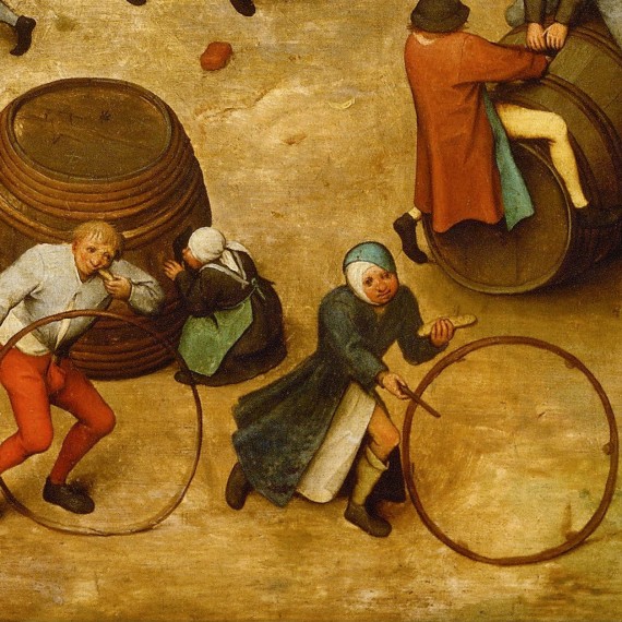 Reifen treiben ist ein Kinderspiel, das bereits auf dem Gemälde "Die Kinderspiele" des flämischen Malers Pieter Bruegel des Älteren von um 1560 zu sehen ist.